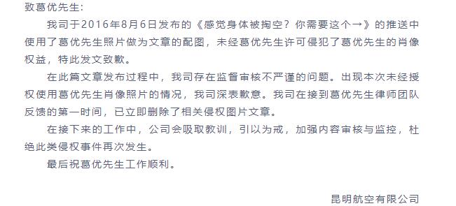 据报道,3月16日,昆明航空就引用演员葛优图片做配图,向其发布致歉声明,未经许可使用葛优先生照片做为配图,特此发文致歉。声明全文为。