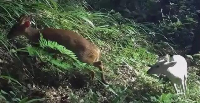 麂,俗称麂子,其中以黄麂居多,而白麂最为罕见,在我国古代曾被称为瑞兽。麂子喜欢独居或者雌雄同栖,主要栖息在小山谷或者杂草丛中,很少会出现群体活动,外出觅食甚至用食过程中,也会随时留意身边四周的情况,一有风吹草动就会躲进密林中,能够拍摄到两种不同的麂类同框属实难得。